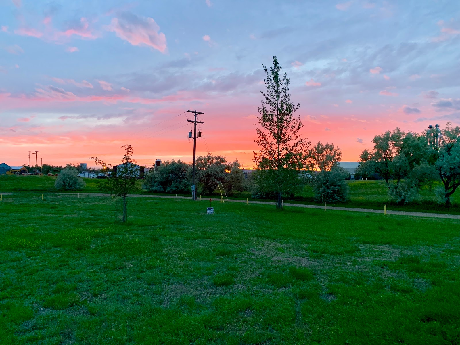 The wind must have turned around because I was doing 18 miles an hour. I was headed northwest passing tall grass, occasional trees, barbwire fences, a high voltage line, rolling hills, beautiful clouds, purple skies, yellow wildflowers, rolling buttes, and eroded Badlands.